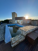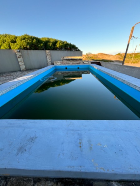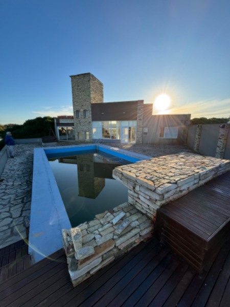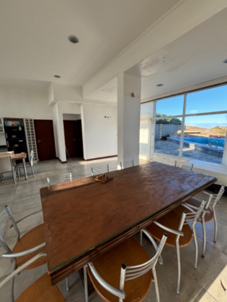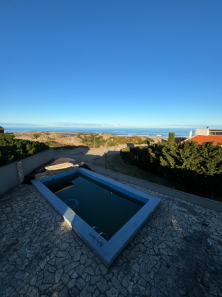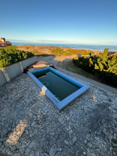 Casa en venta en Mar Chiquita frente al mar. Al ingreso: living comedor con cocina incorporada todo con vista a la pileta y playa. 5 dormitorios 2 en suite. 3 baños. Garage 2 autos. Parque. Piscina 10 x 5 con skimer y cascada para oxigenar y decorativa. Apto Gastronomia.